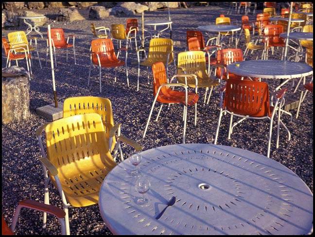 Café tables in the late afternoon, La Forclaz (France) - 1981